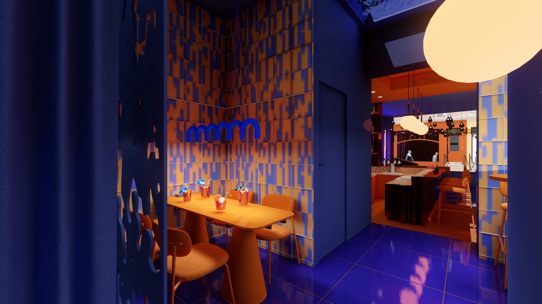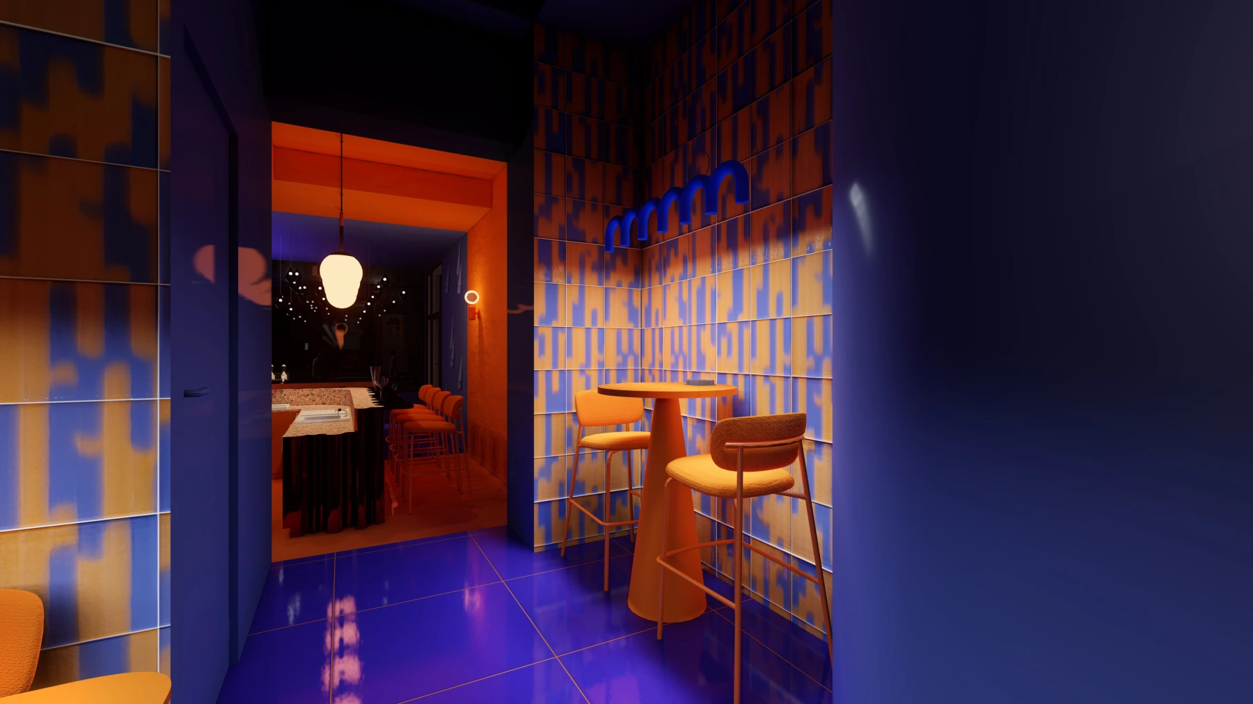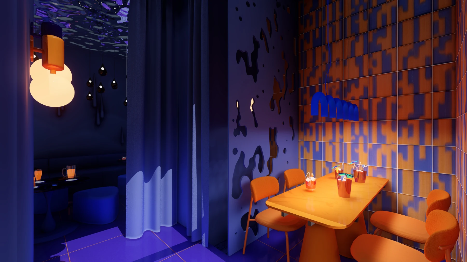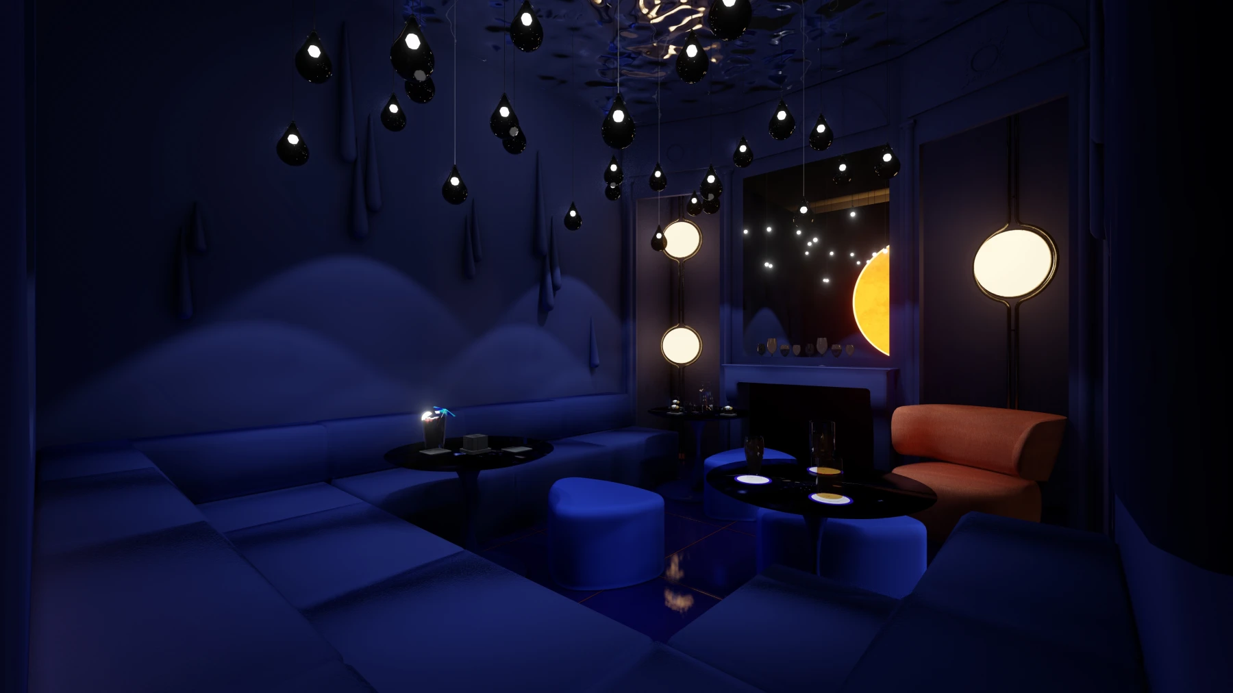 Si le rez-de-chaussée oppose avec clarté le bleu et le cognac, le sous-sol joue davantage sur leur fusion, créant une continuité visuelle et matérielle entre les deux espaces. L’ensemble compose un univers harmonieux, oscillant entre rigueur graphique et fluidité organique, qui redéfinit l’expérience du bar.
