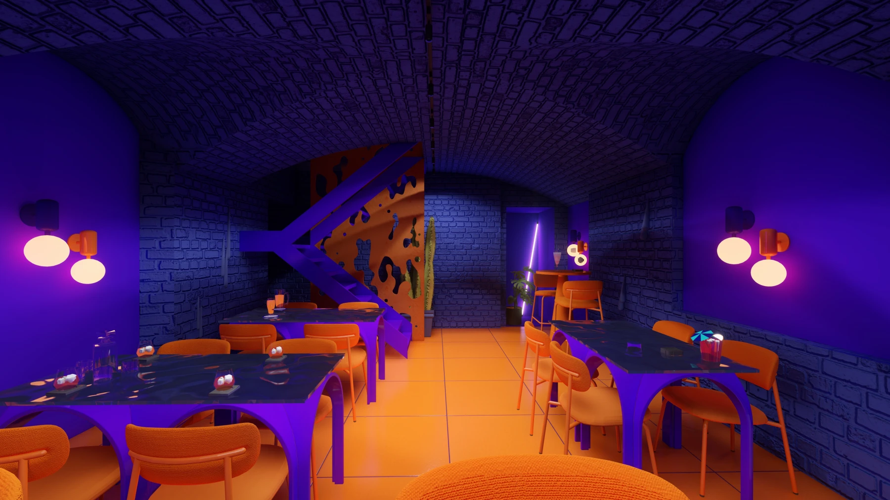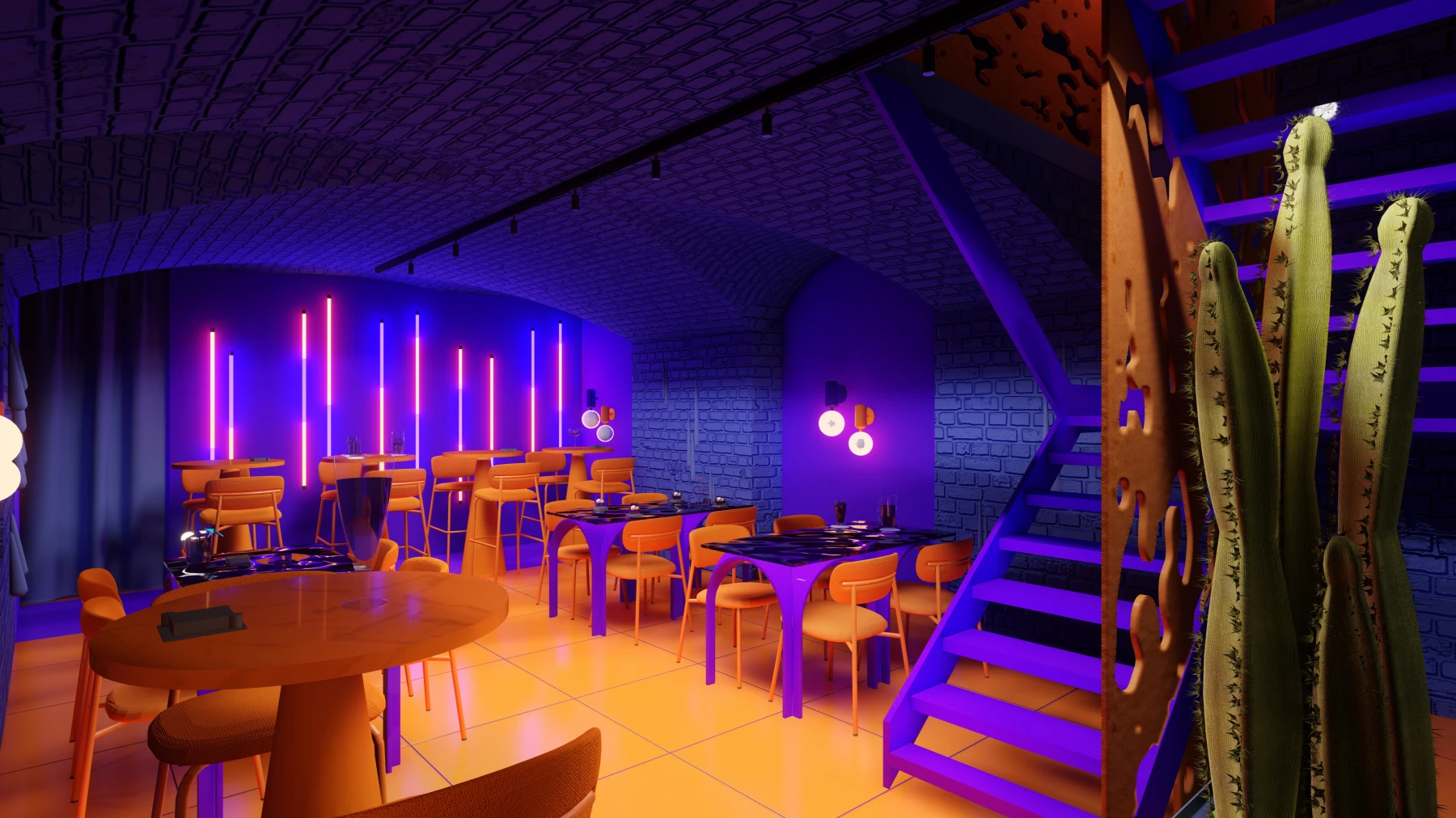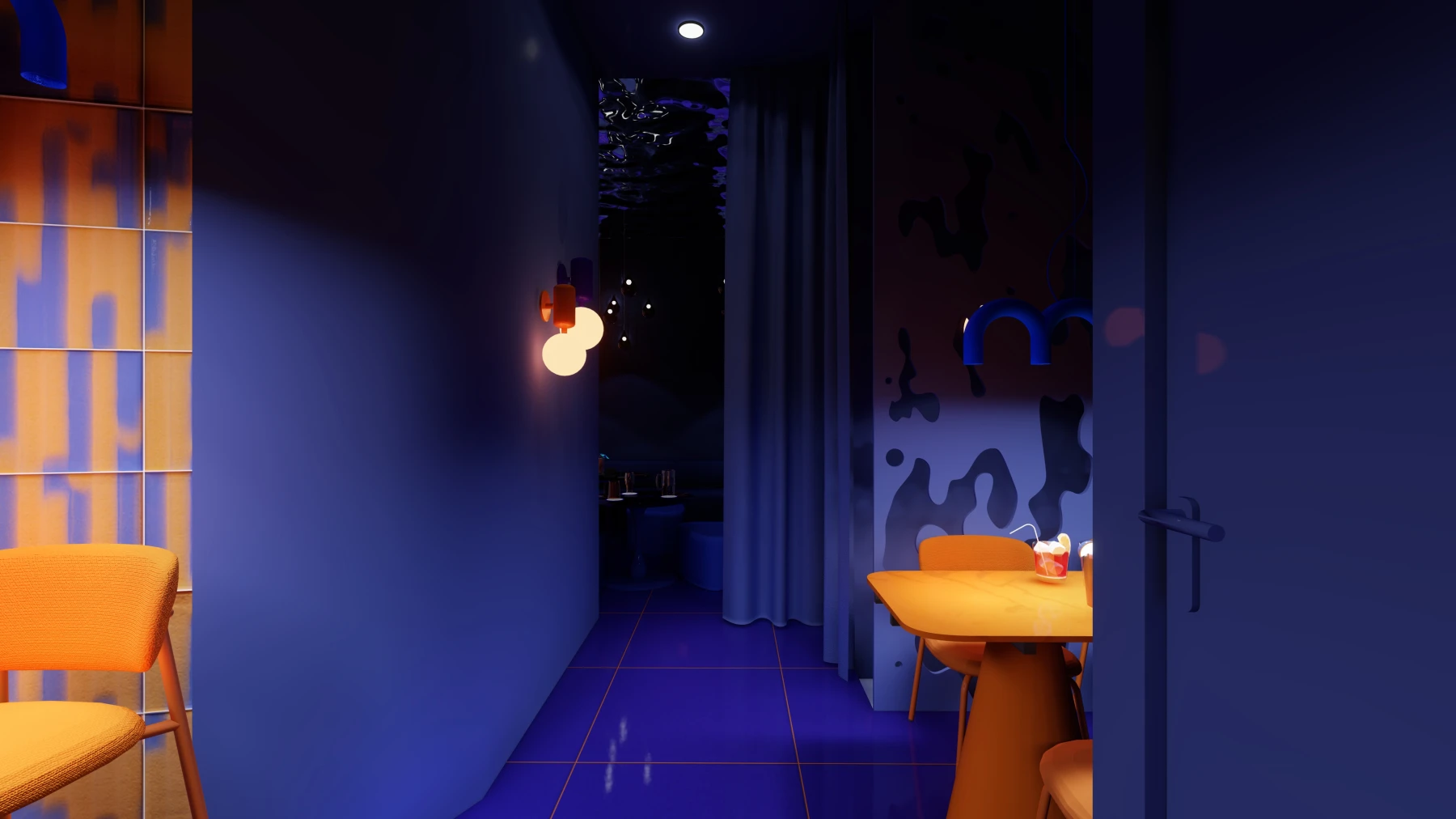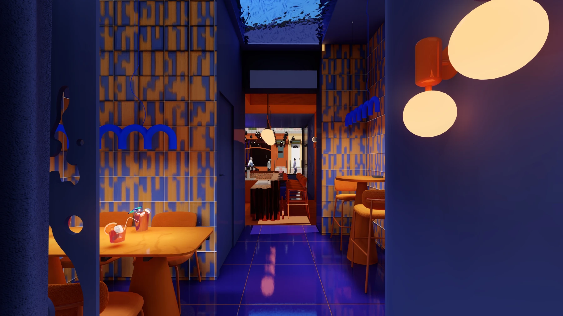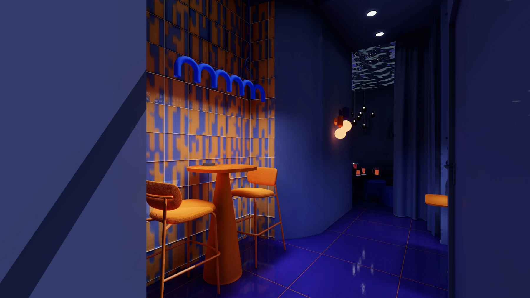 Si le rez-de-chaussée oppose avec clarté le bleu et le cognac, le sous-sol joue davantage sur leur fusion, créant une continuité visuelle et matérielle entre les deux espaces. L’ensemble compose un univers harmonieux, oscillant entre rigueur graphique et fluidité organique, qui redéfinit l’expérience du bar.