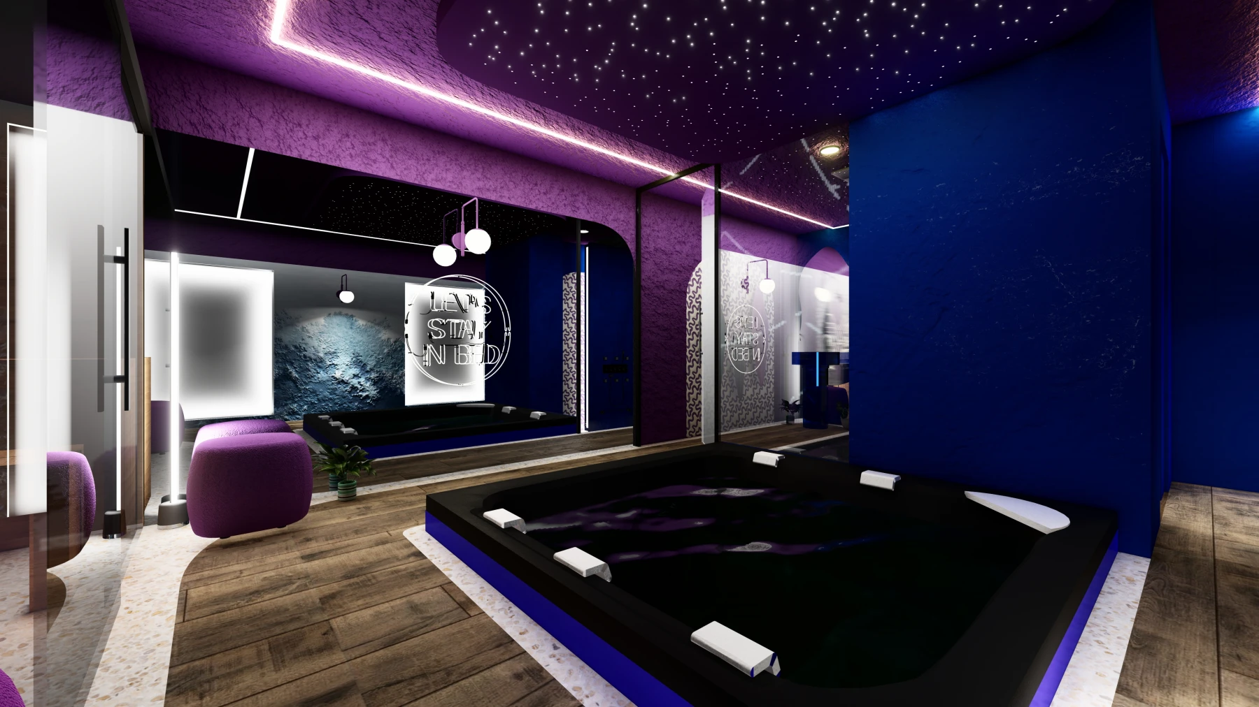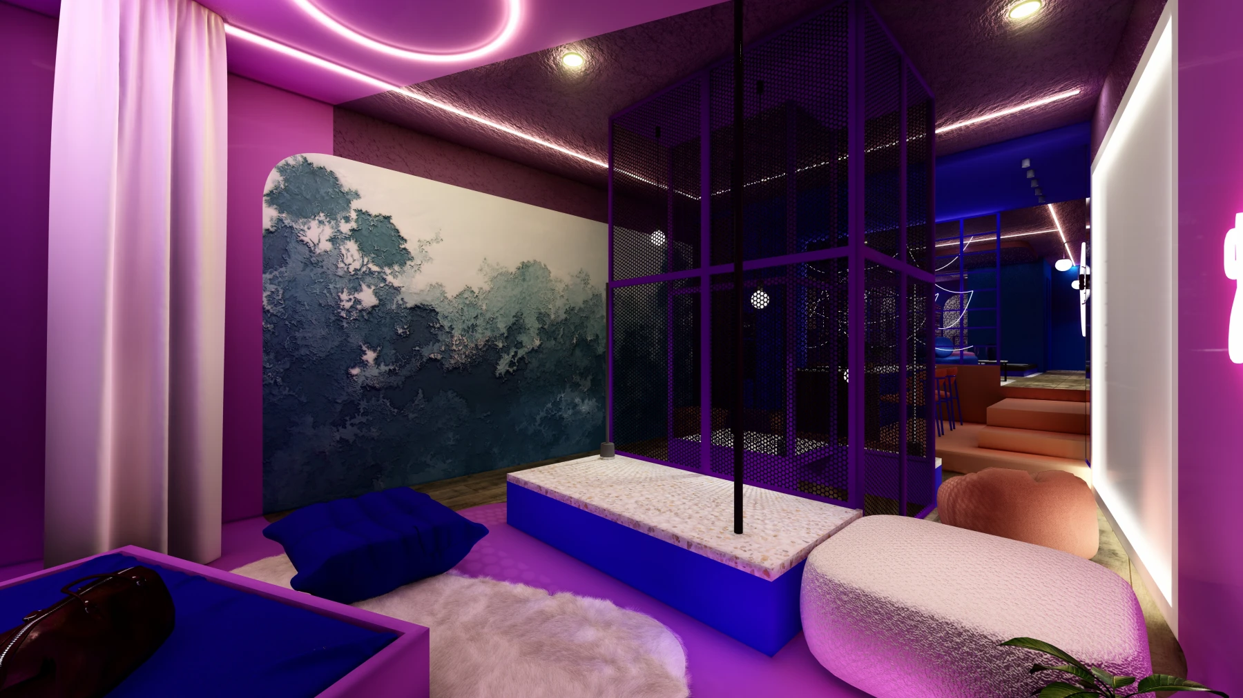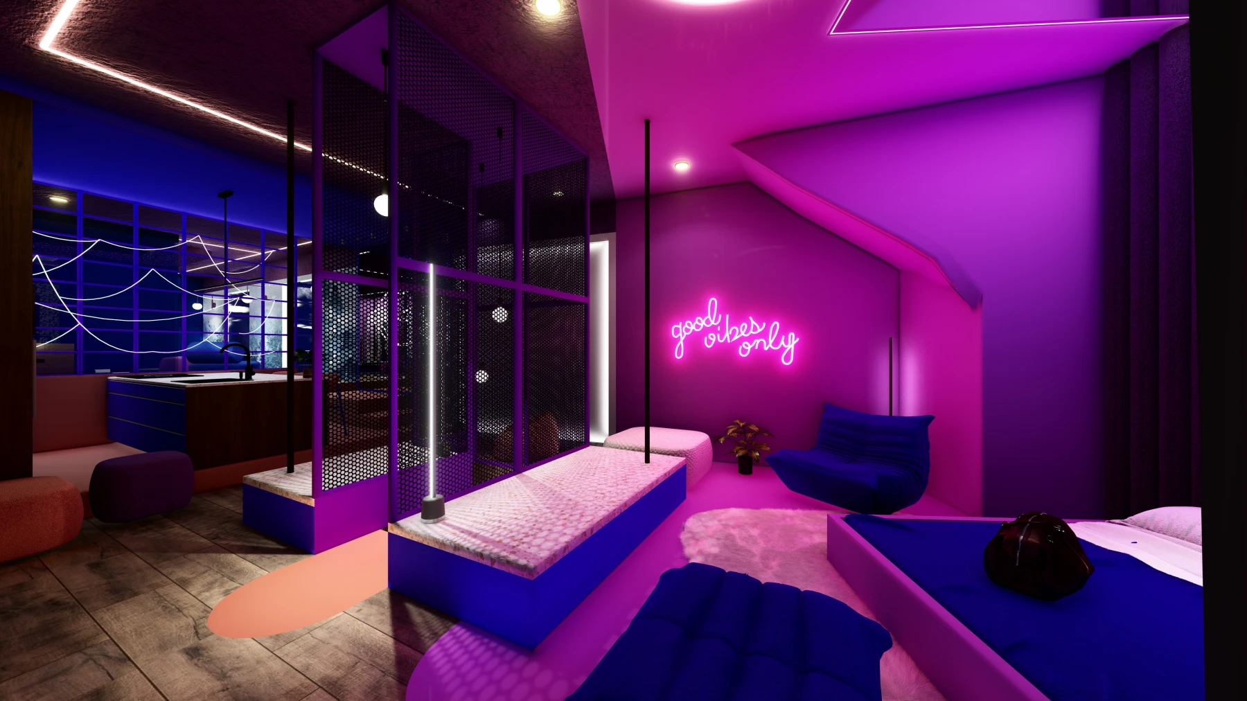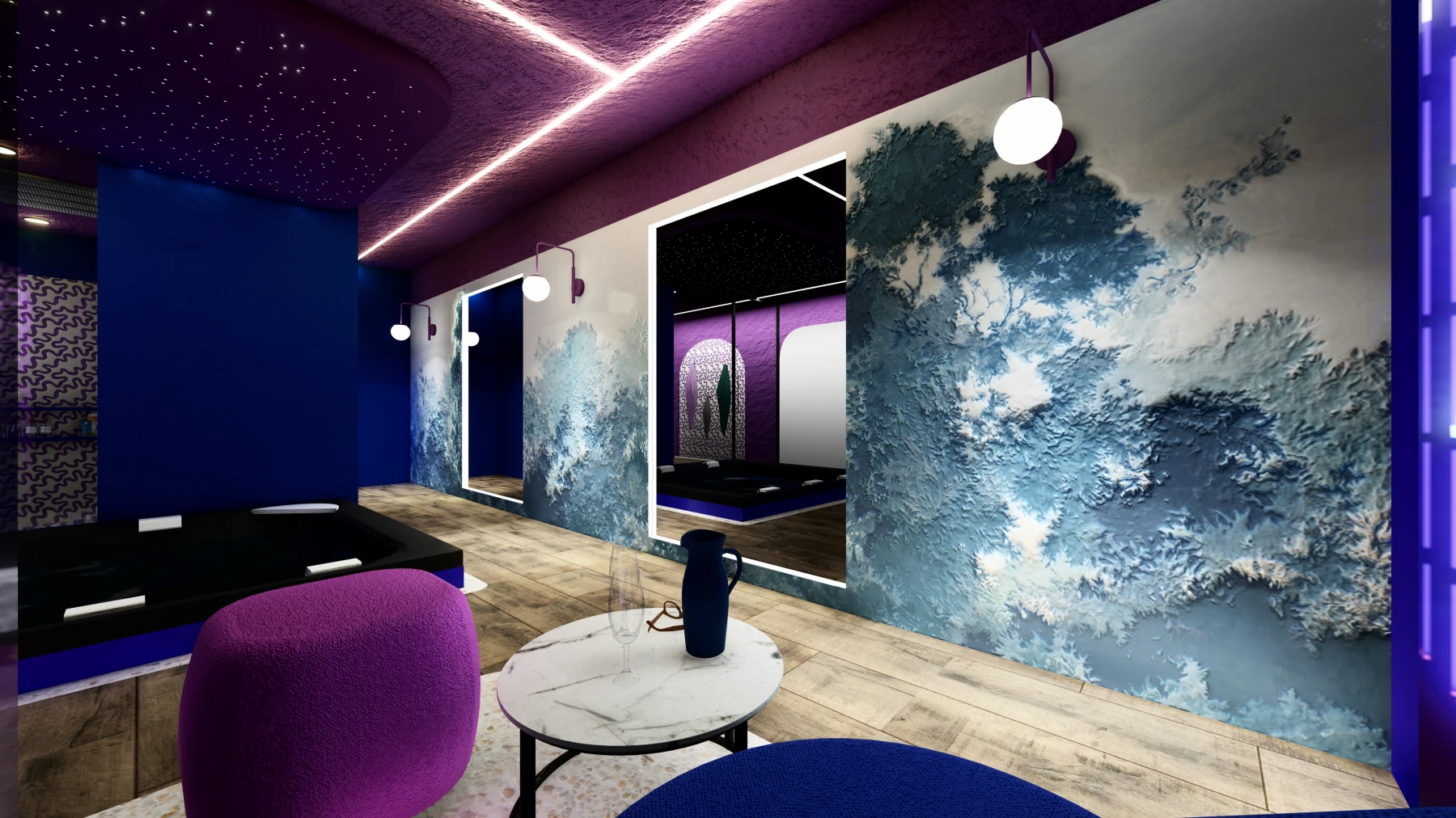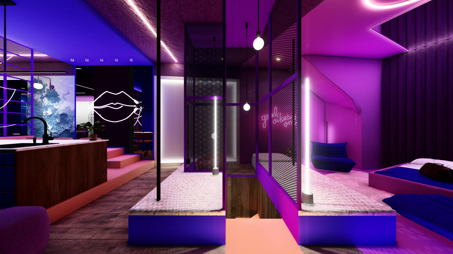 Les différents espaces; espace nuit, cuisine, zone bien-être avec sauna et jacuzzi, puis espaces de divertissement; se succèdent dans une palette chromatique allant du bleu au rose, créant une atmosphère intime, immersive et cohérente sur l’ensemble de la Love Room.