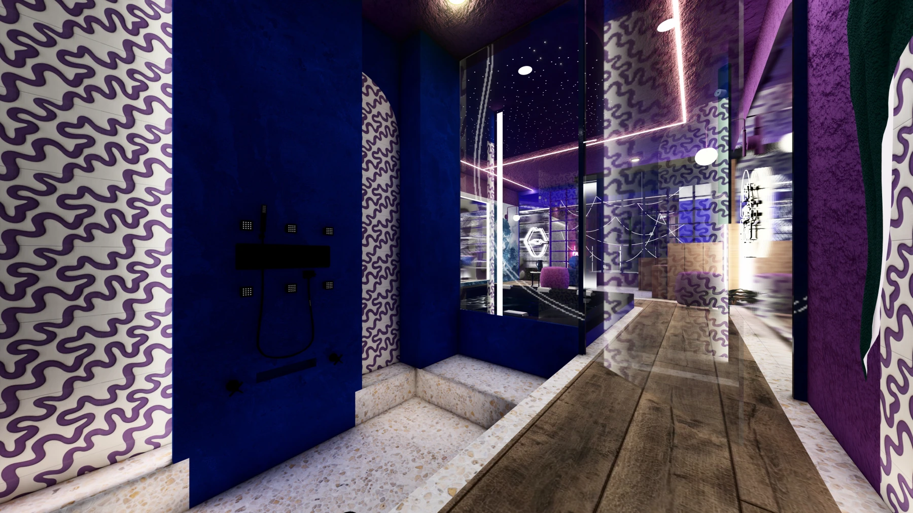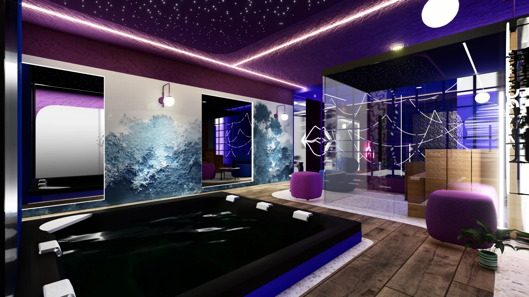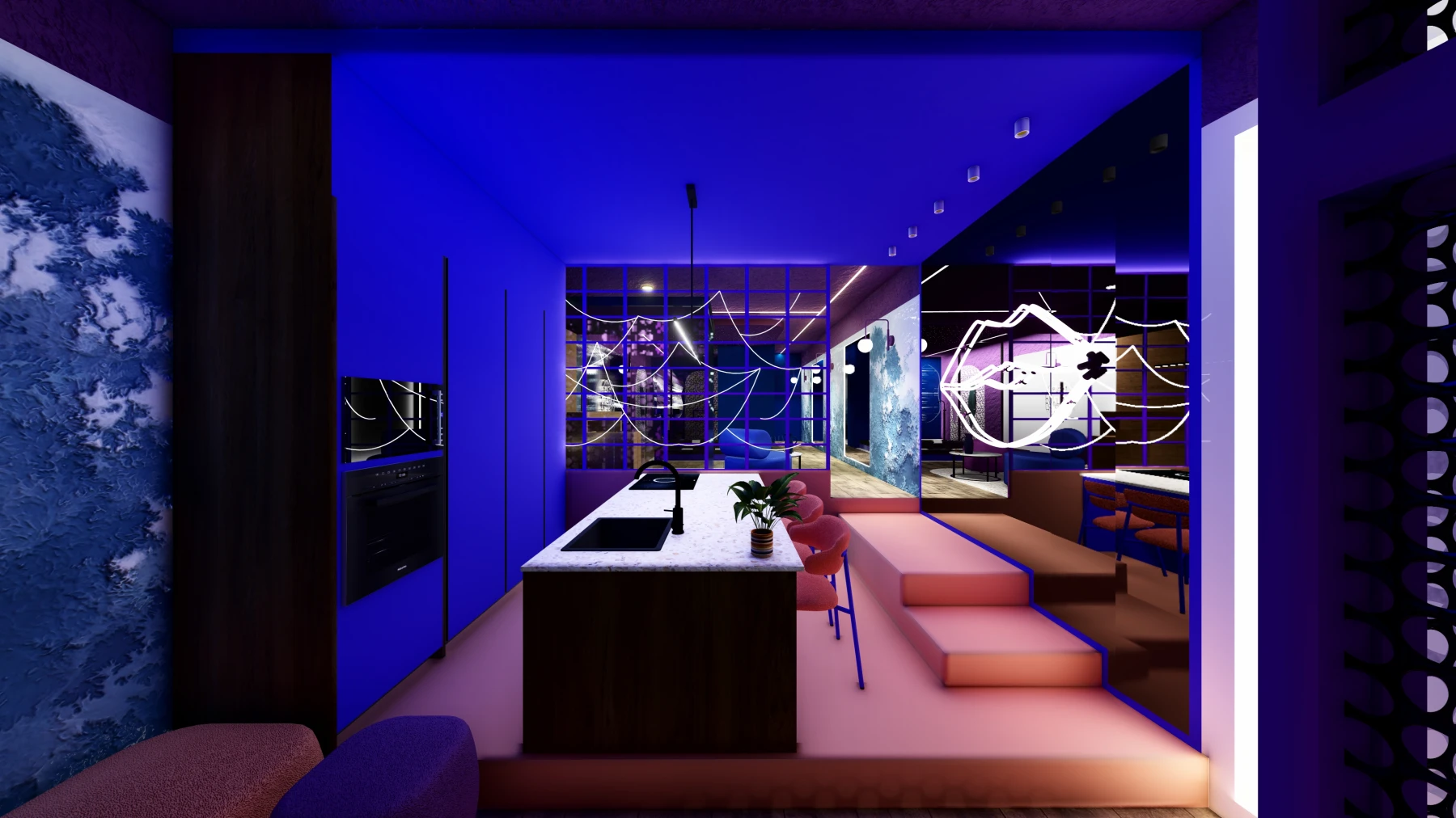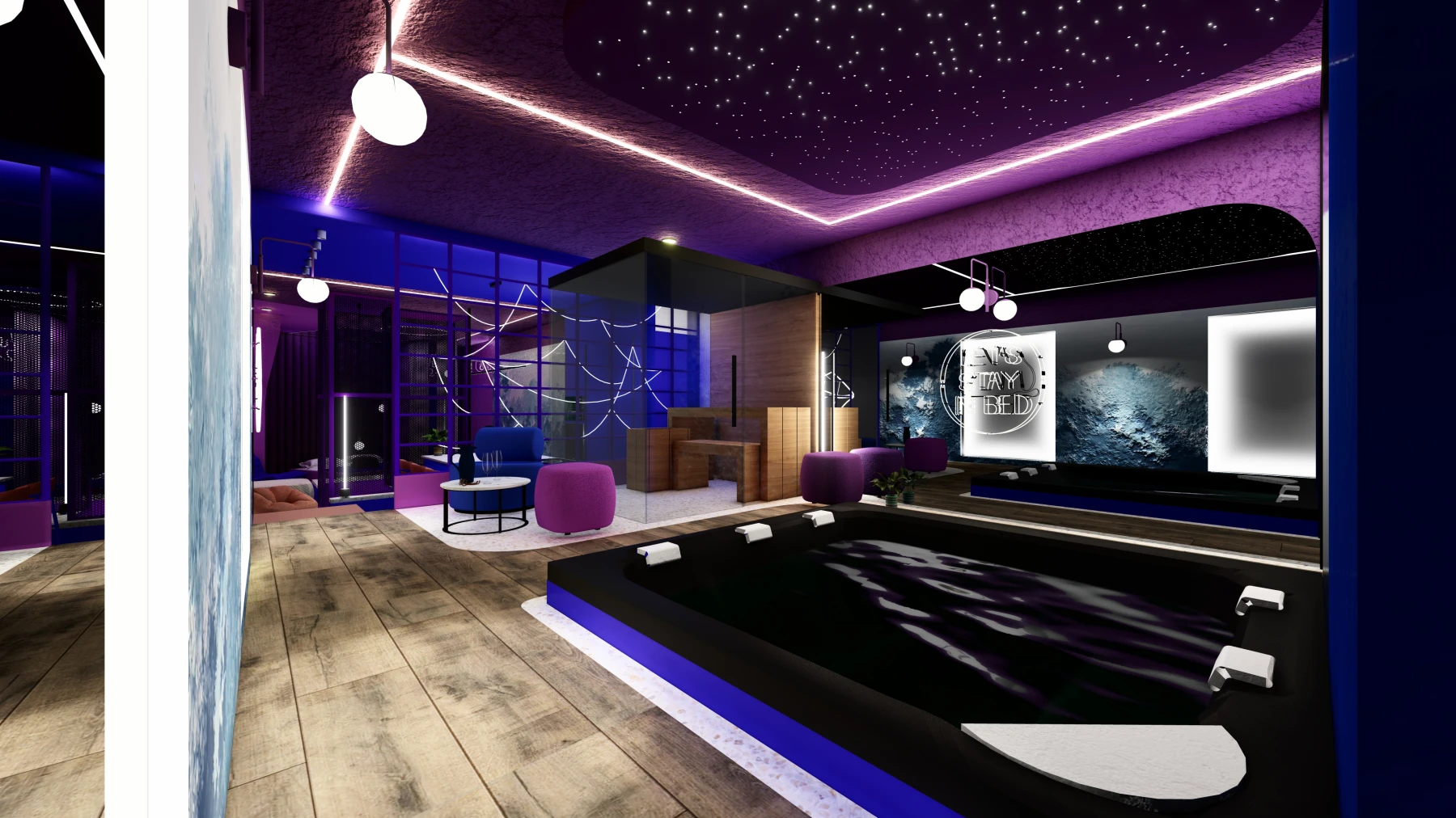 Les différents espaces; espace nuit, cuisine, zone bien-être avec sauna et jacuzzi, puis espaces de divertissement; se succèdent dans une palette chromatique allant du bleu au rose, créant une atmosphère intime, immersive et cohérente sur l’ensemble de la Love Room.