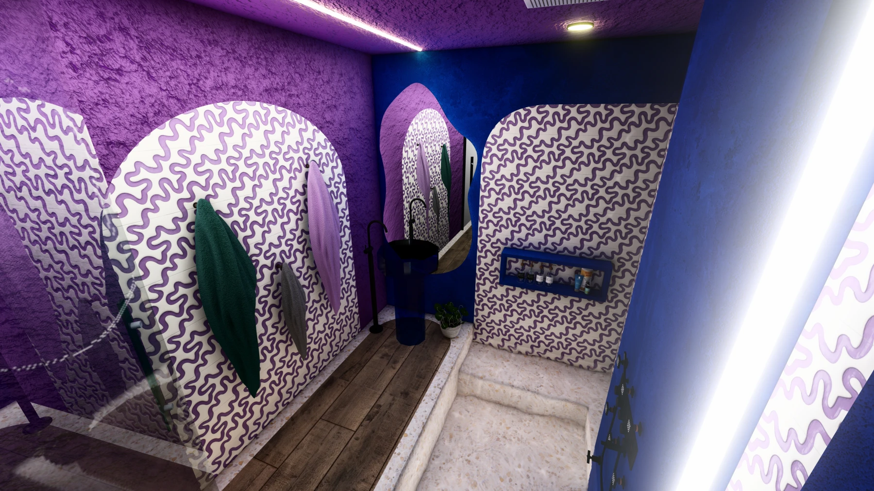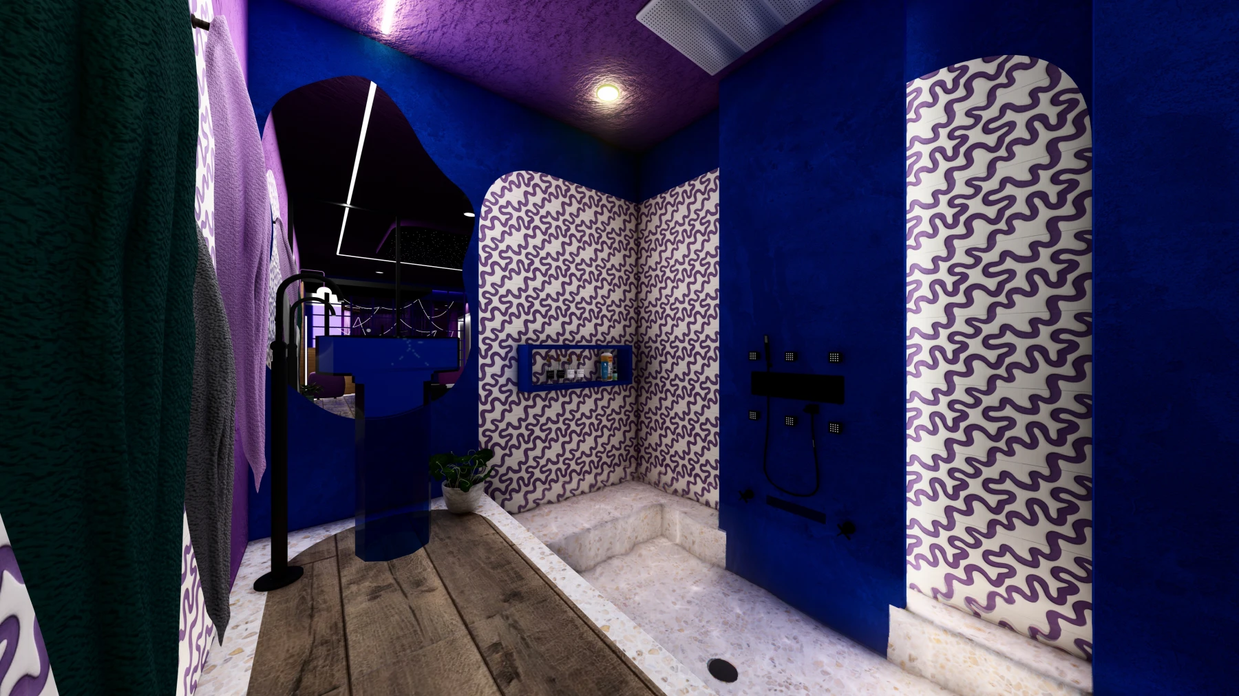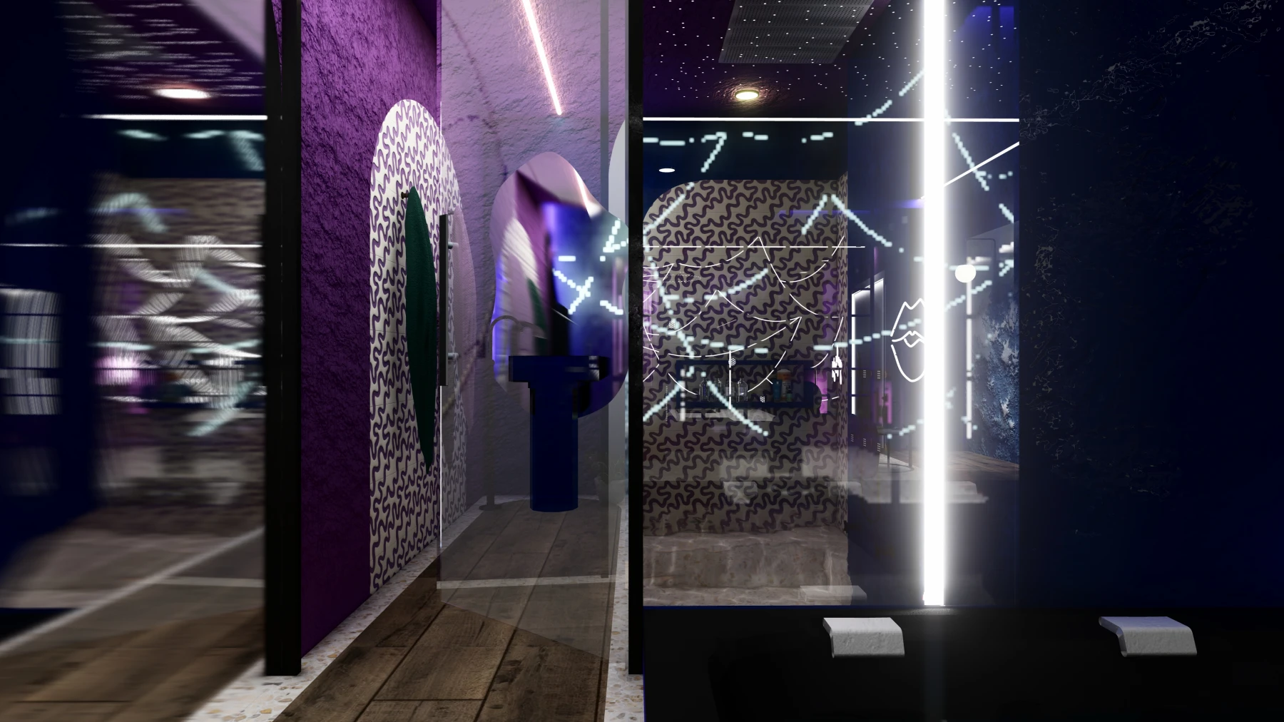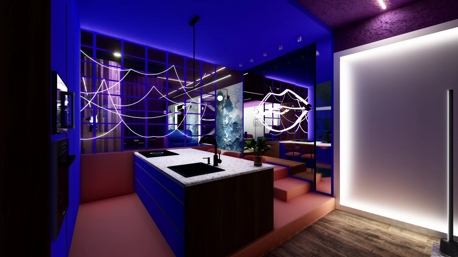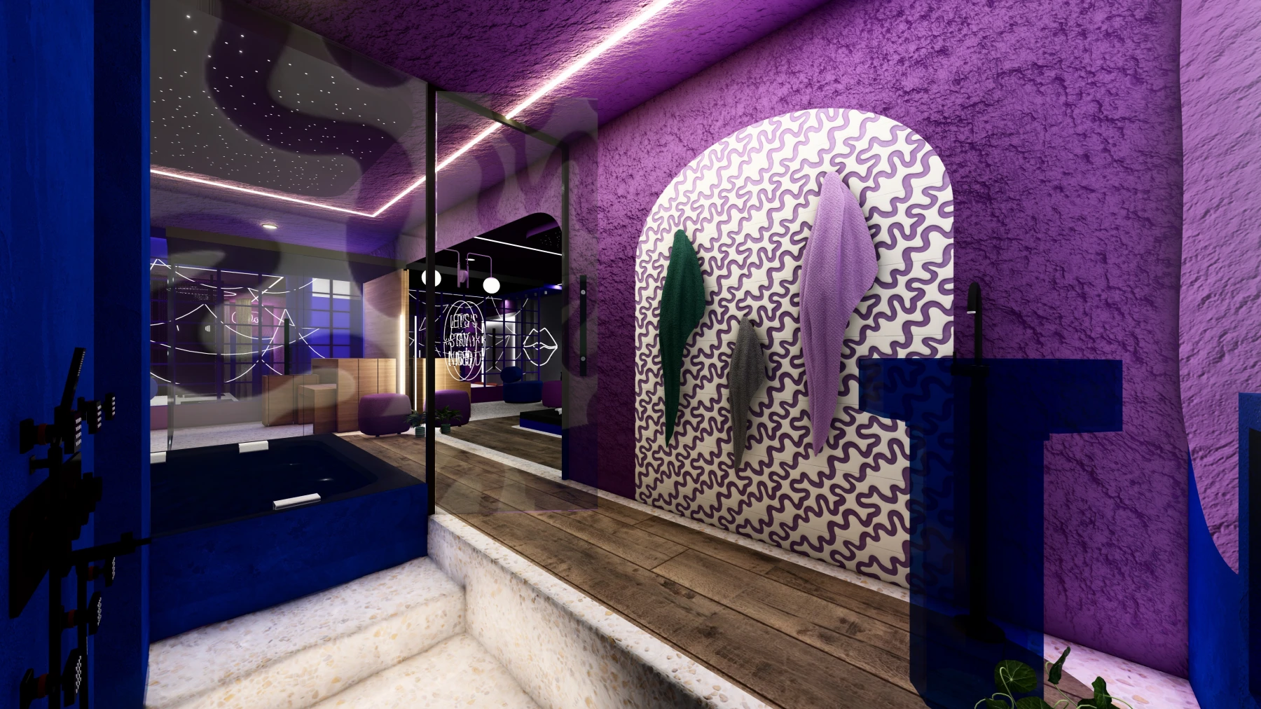 Les différents espaces; espace nuit, cuisine, zone bien-être avec sauna et jacuzzi, puis espaces de divertissement; se succèdent dans une palette chromatique allant du bleu au rose, créant une atmosphère intime, immersive et cohérente sur l’ensemble de la Love Room.